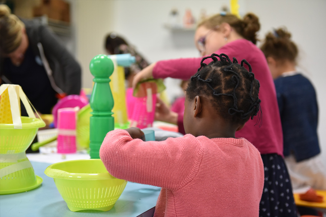 Une visite où les enfants découvrent les expositions à travers des activités variées : jeu de construction, activation de performance, lecture de conte, et plus encore.